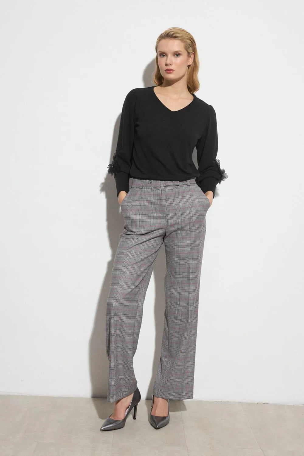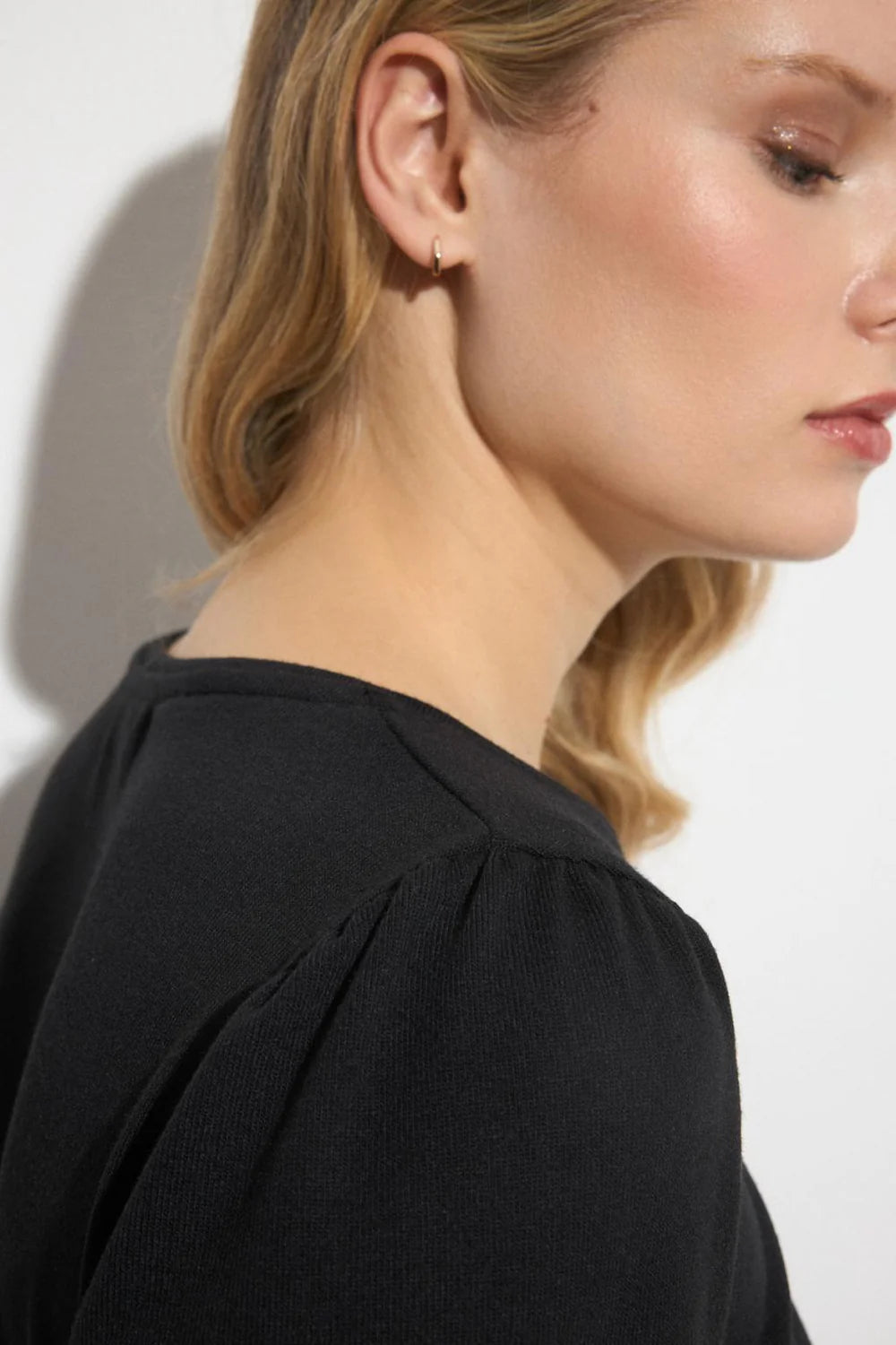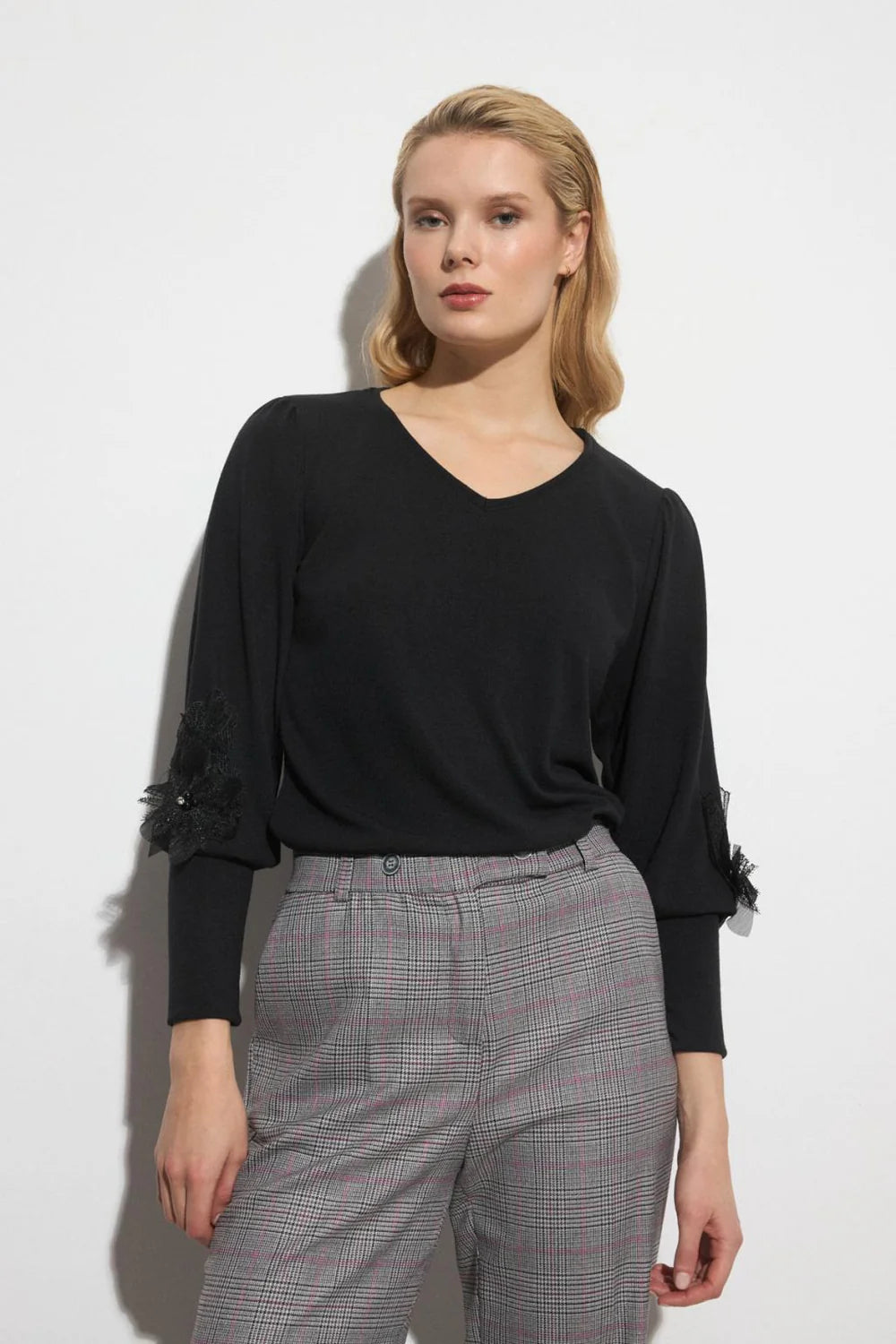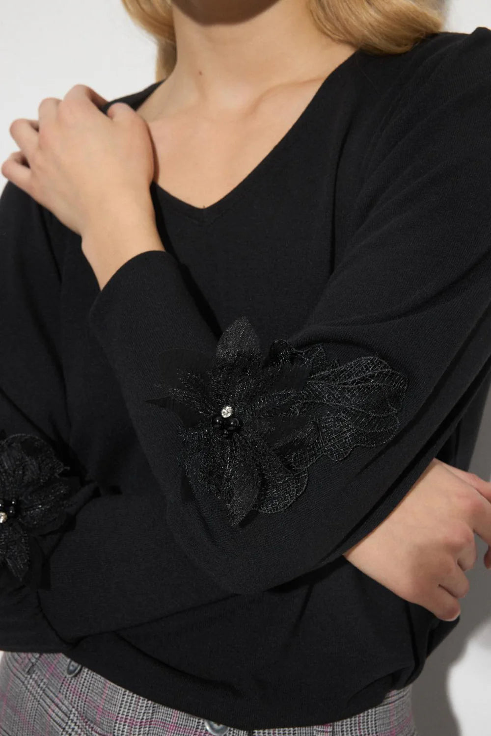 Plain T-shirt. V-neckline collar. Long sleeve with floral lace trim detail with rhinestones finished in long cuff.