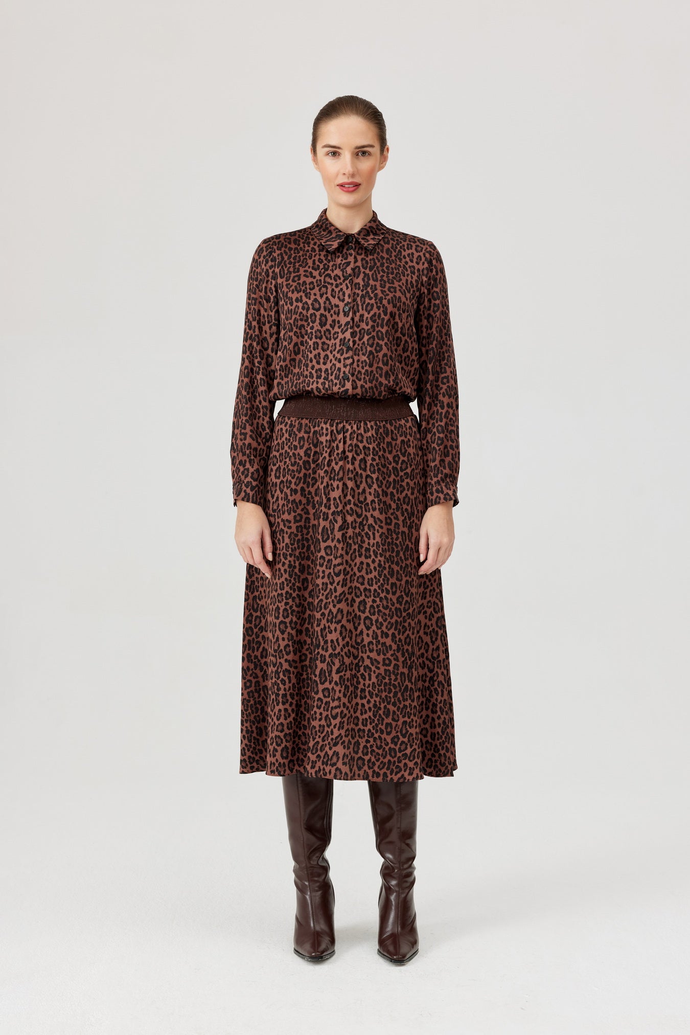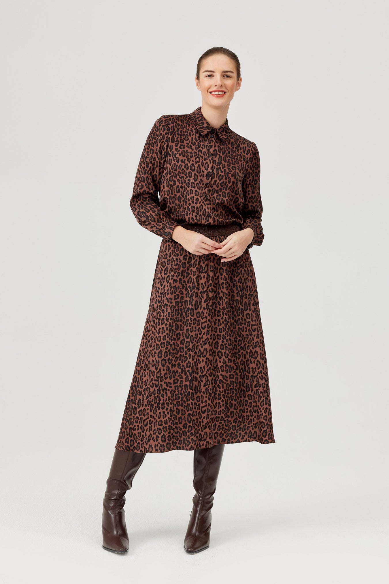 Fia panther shirt - a bold accent in a classic form. Straight cut shirt, made of light satin viscose fabric with a fashionable panther pattern in shades of brown and black. It has a classic collar, long sleeves with cuffs and a full-length button closure. Great for office and casual styling - wear it with jeans, black pants or a skirt to add a predatory character to your sets in an elegant