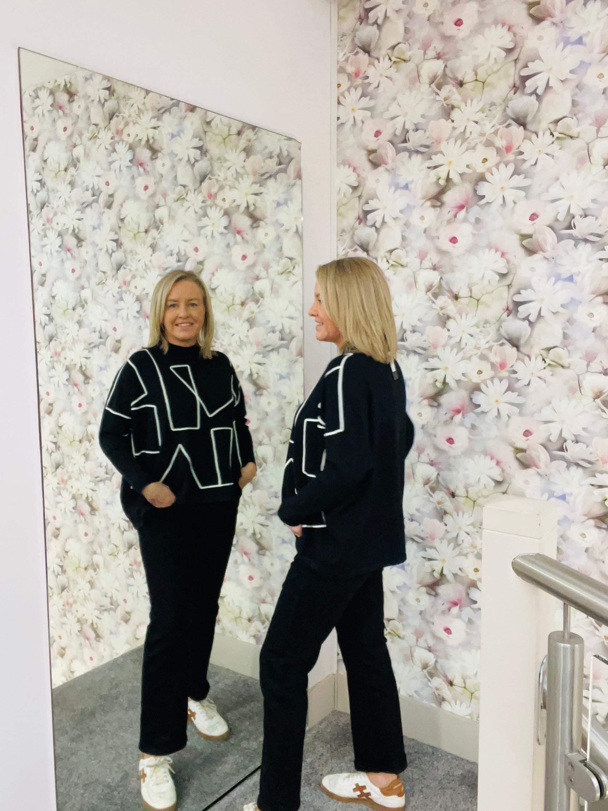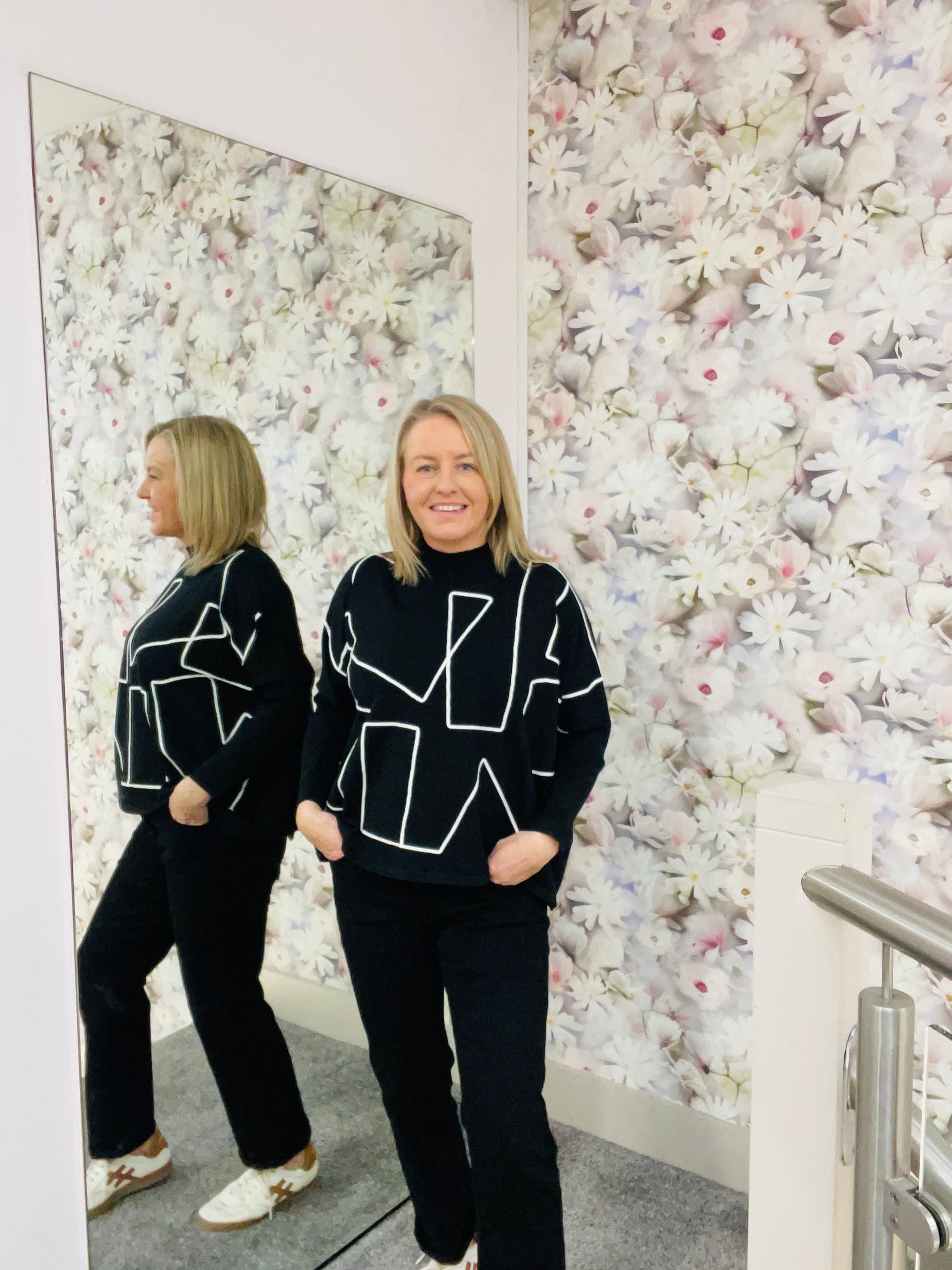 sweater with a geometric pattern - a fashionable accent in your wardrobe. A modern oversize sweater with a striking, contrasting geometric pattern. The black background is broken by white lines that create a graphic composition and add character. The model with a lowered shoulder line, long sleeves and a turtleneck provides comfort and a stylish look. Delicate, pleasant to the touch knitwear guarantees wearing comfort. Perfect for minimalist stylisations - it looks great with both simple trousers and a midi skirt.