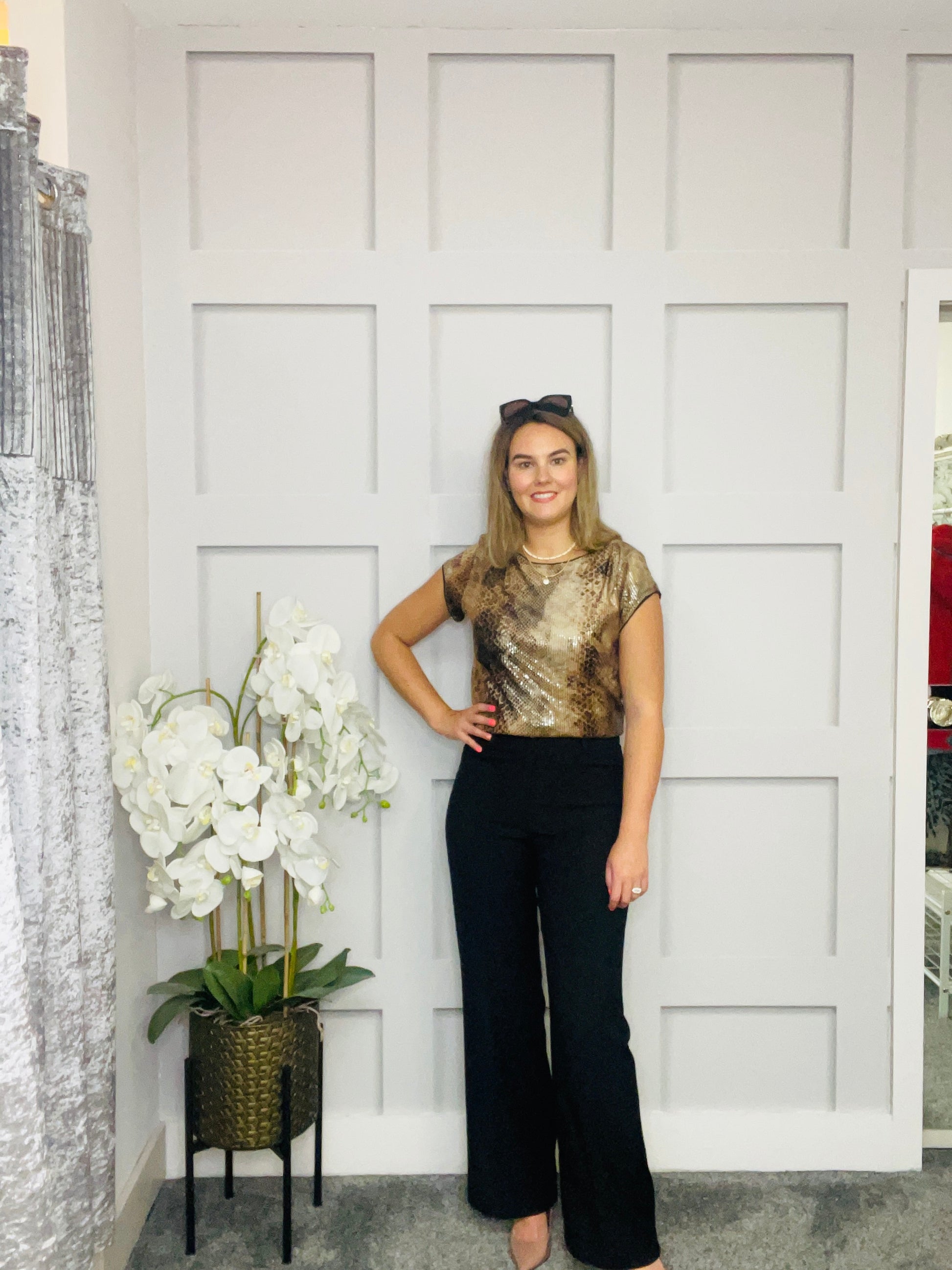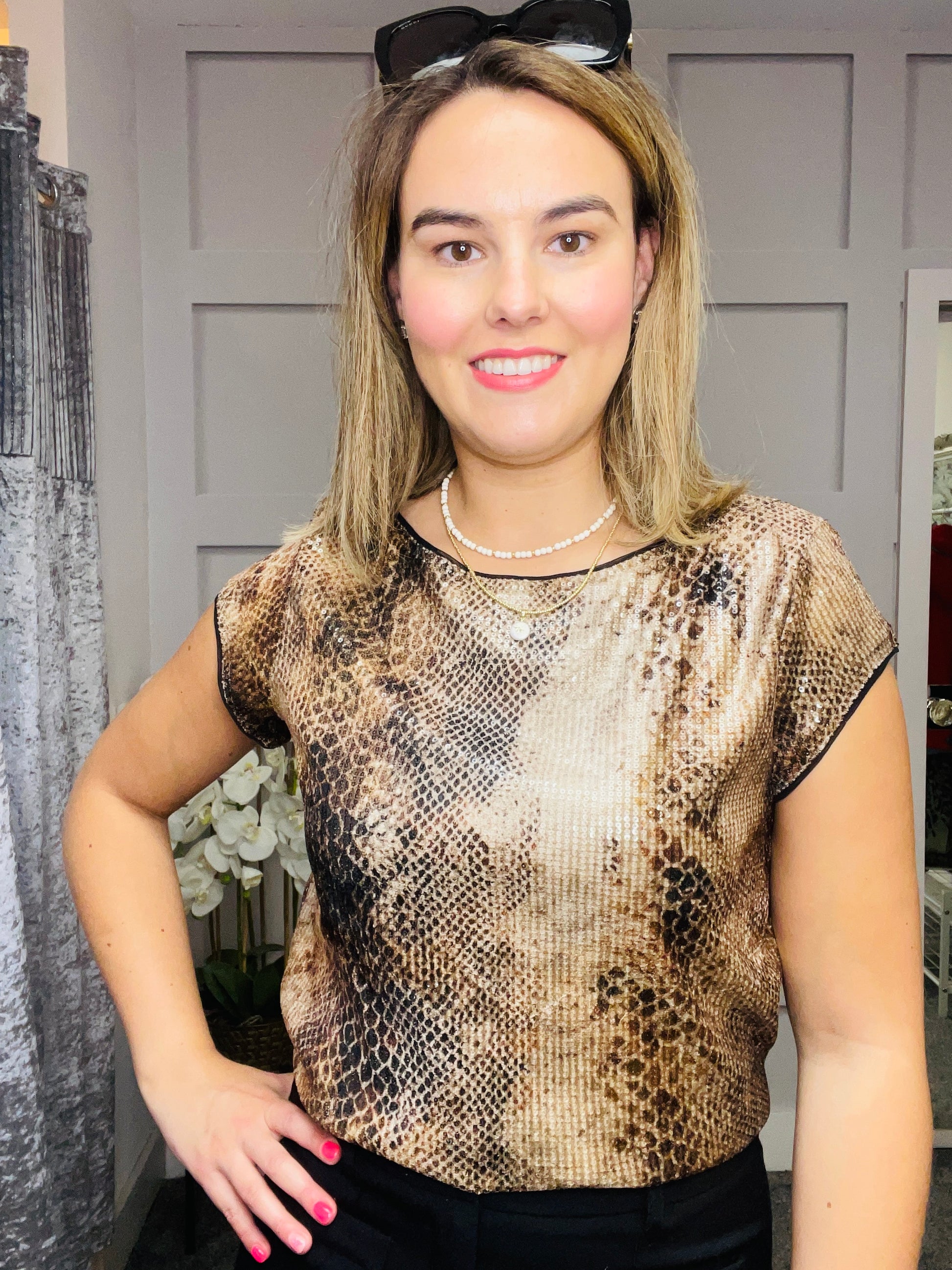 ..beige,camel,black and brown sequin top