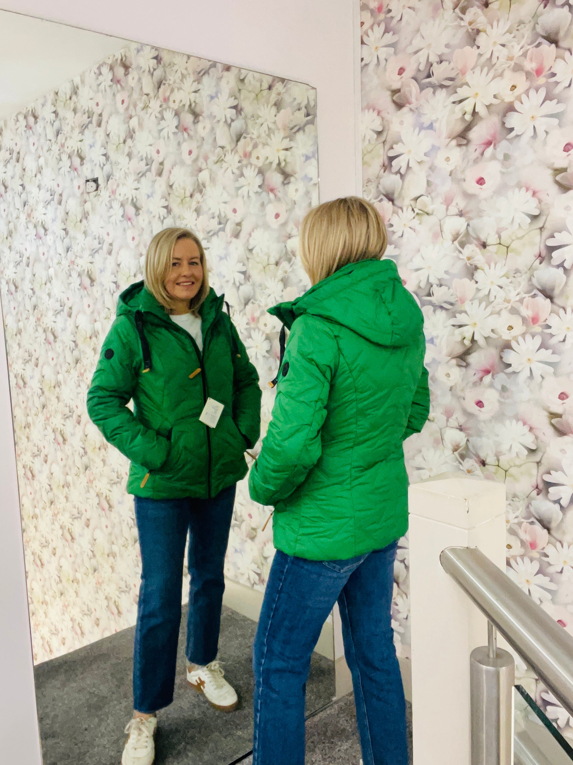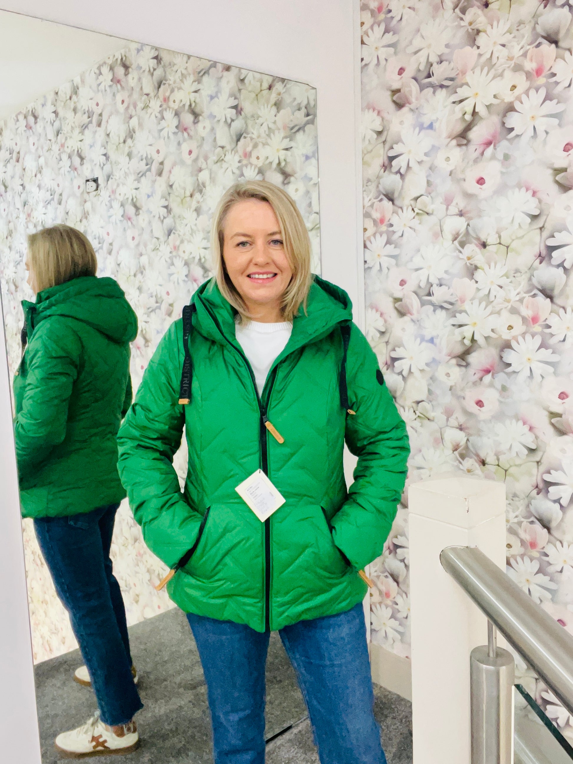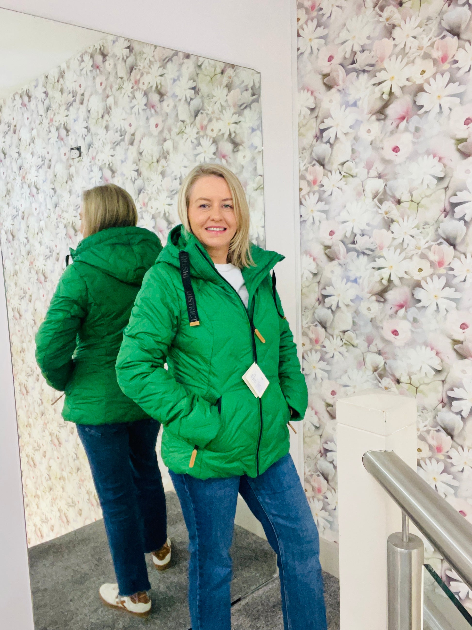 Recycled Imidons jacket, water-repellent with heat-seal fantasy stripe quilting. Detachable, adjustable hood. Black contrast zippers with leather pullers. Two zippered slit pockets and inner zippered pocket. Ribbed wind catchers in cuffs.