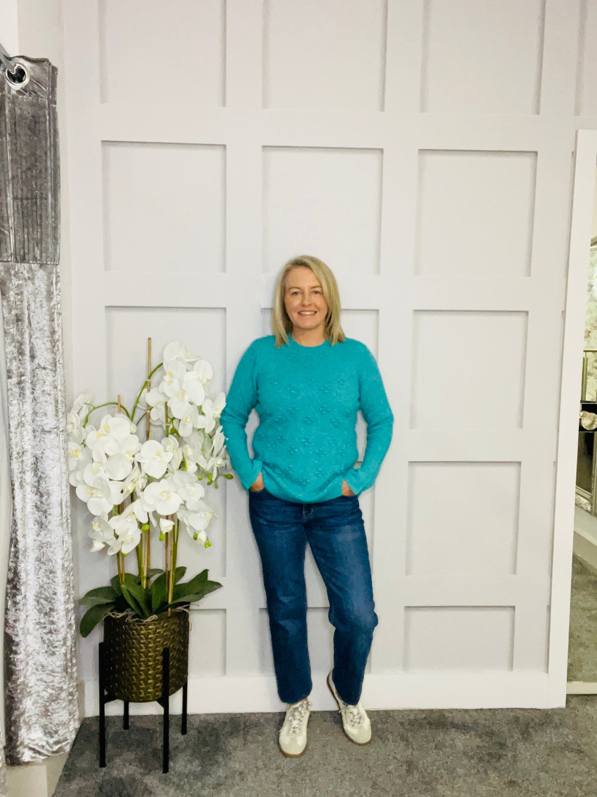Plain knit sweater. Round neck. Straight design with details on the front and cuffs. Long sleeve. Low straight.