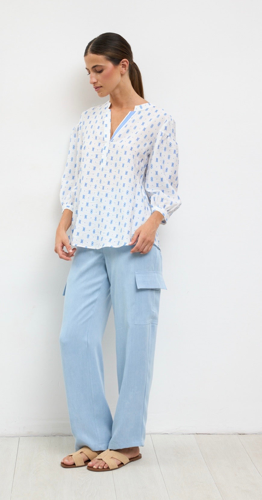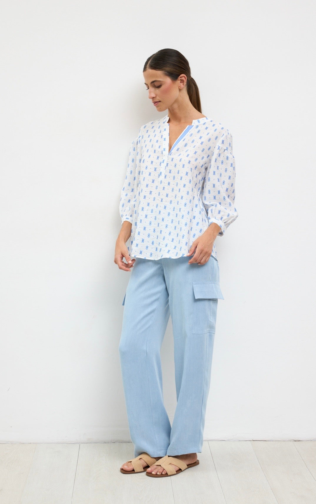 . White shirt with blue pattern