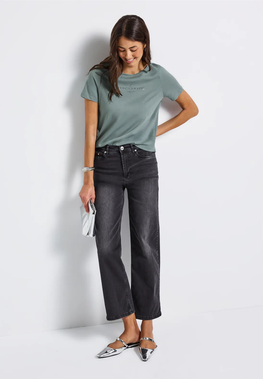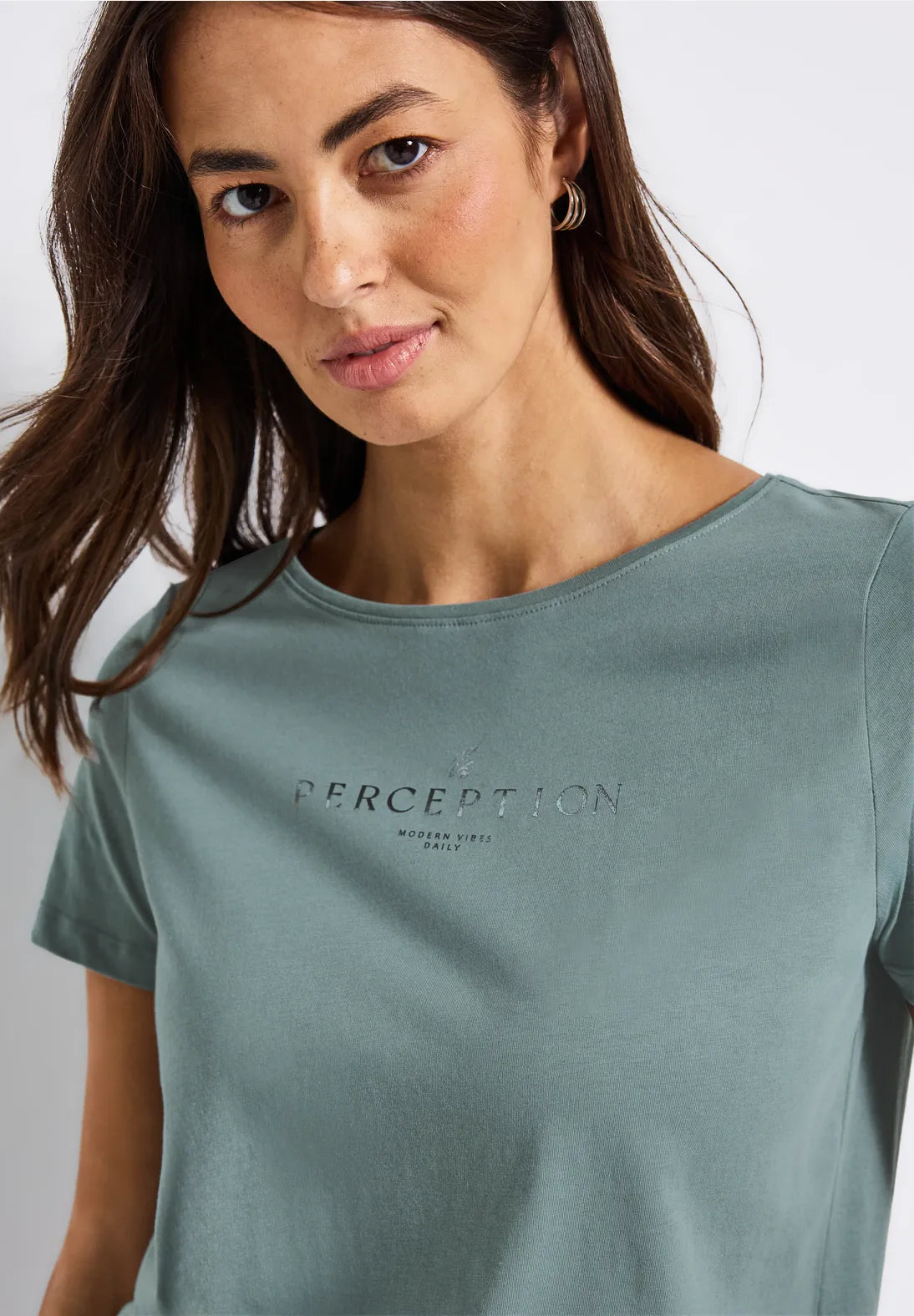 With fashionable wording artwork and soft cotton quality, this Street One t-shirt for women will be your new favourite piece. The classic round neckline and the short sleeves make it versatile - whether casual with denim or with skirts. The pure cotton fabric guarantees a particularly pleasant wearing comfort.