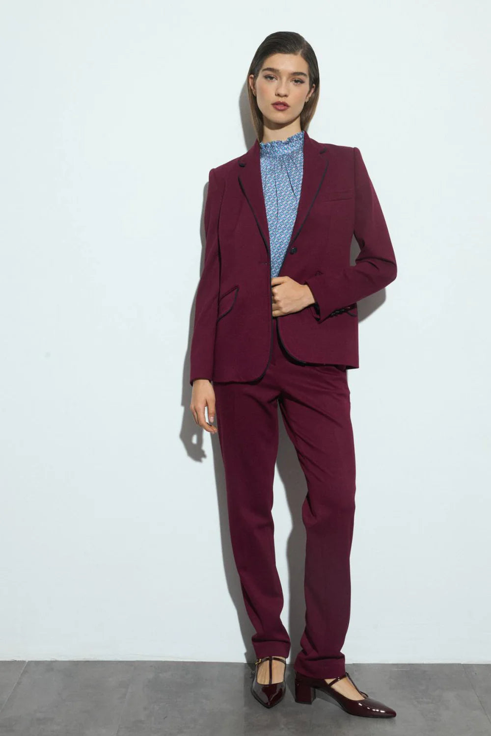 Flat-tatched jacket. Collar with notce flap and contrasting trim detail. Front closure with contrasting button. Long sleeve with false contrasting button closure. Two front flap pockets with contrasting piping. Long to the hip. Straight sow with rounded ends.