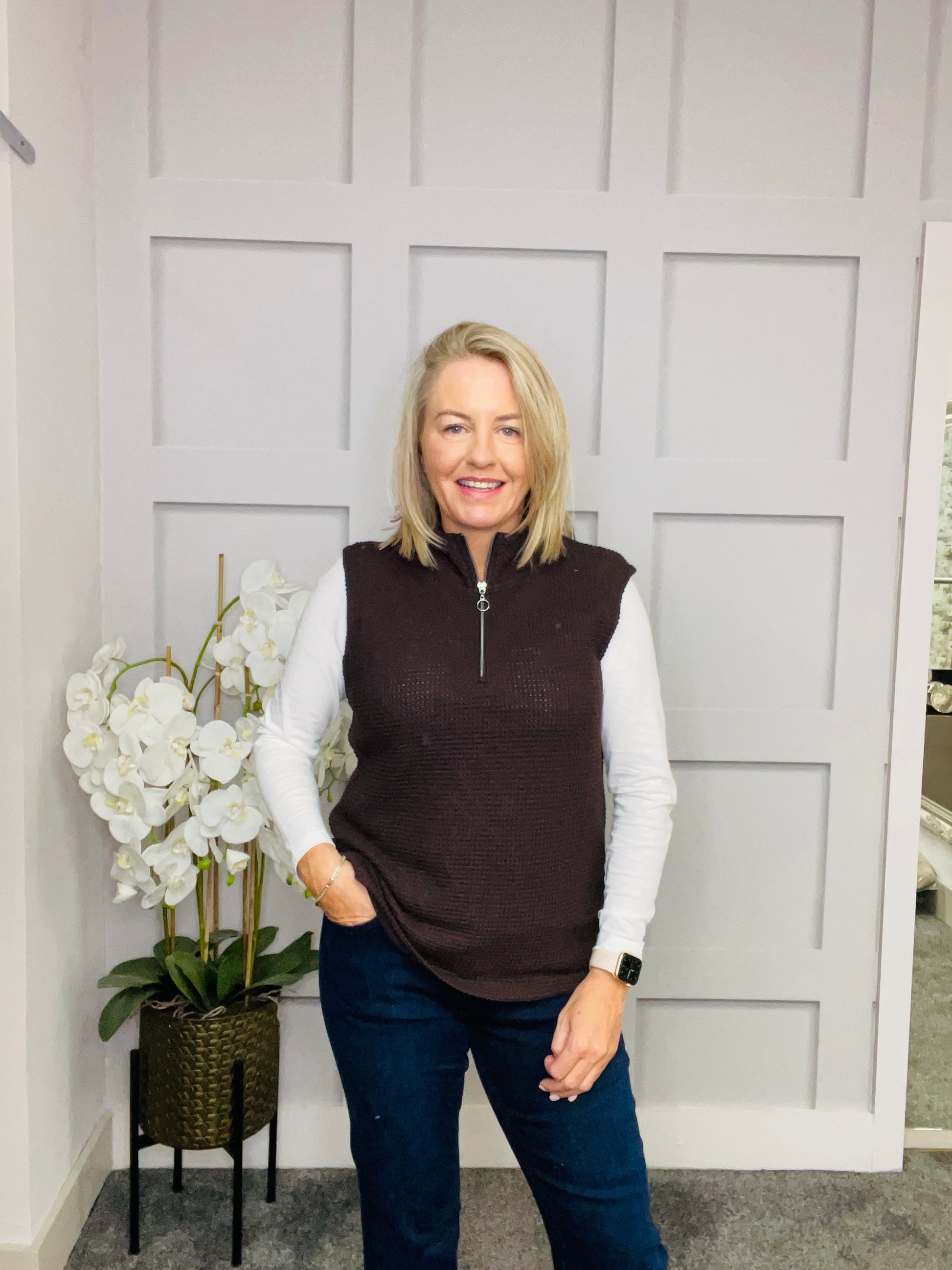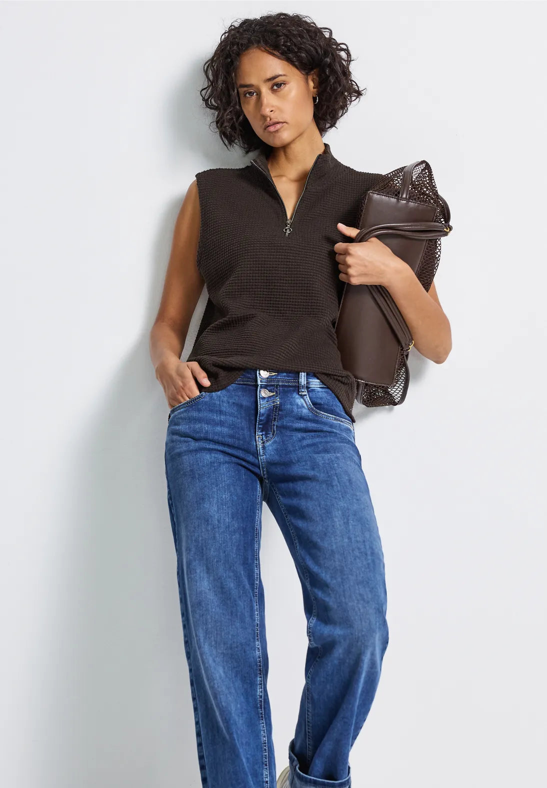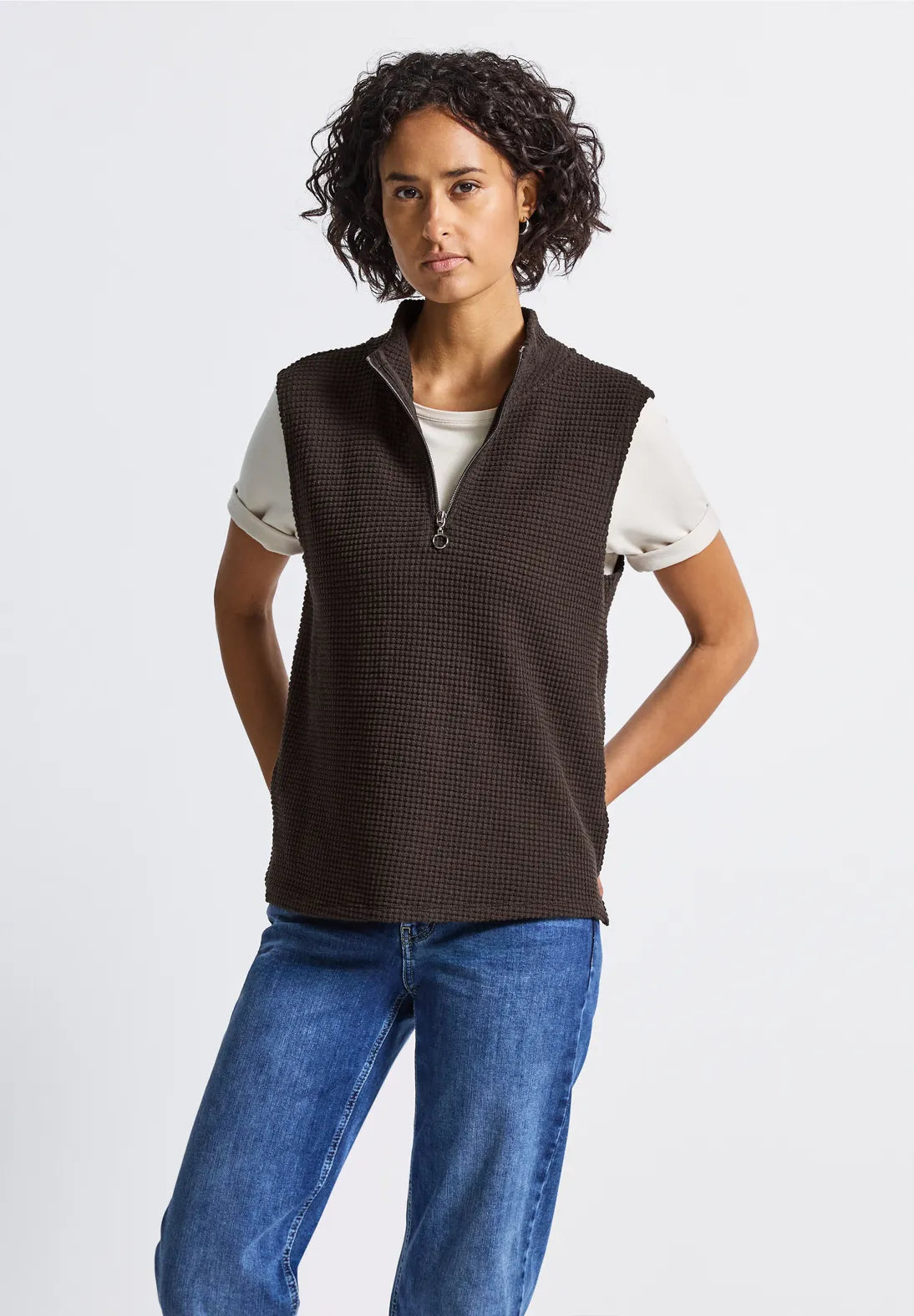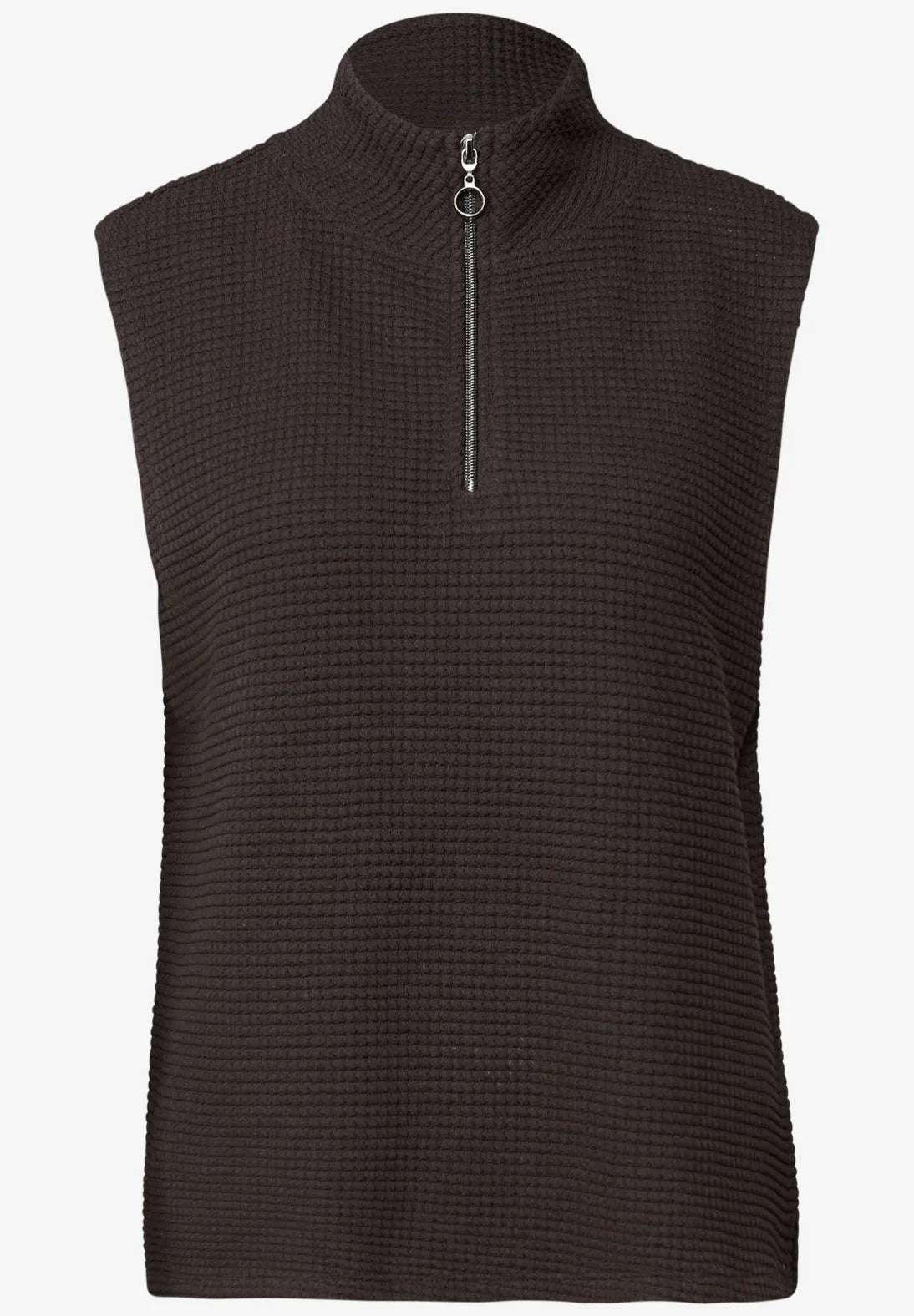 The sleeveless structured top for women brings modern sophistication to your look with a turtleneck and decorative zipper detail. The soft quality ensures high wearing comfort, while side slits provide freedom of movement and a fashionable twist. Ideal for trend-conscious layering outfits.