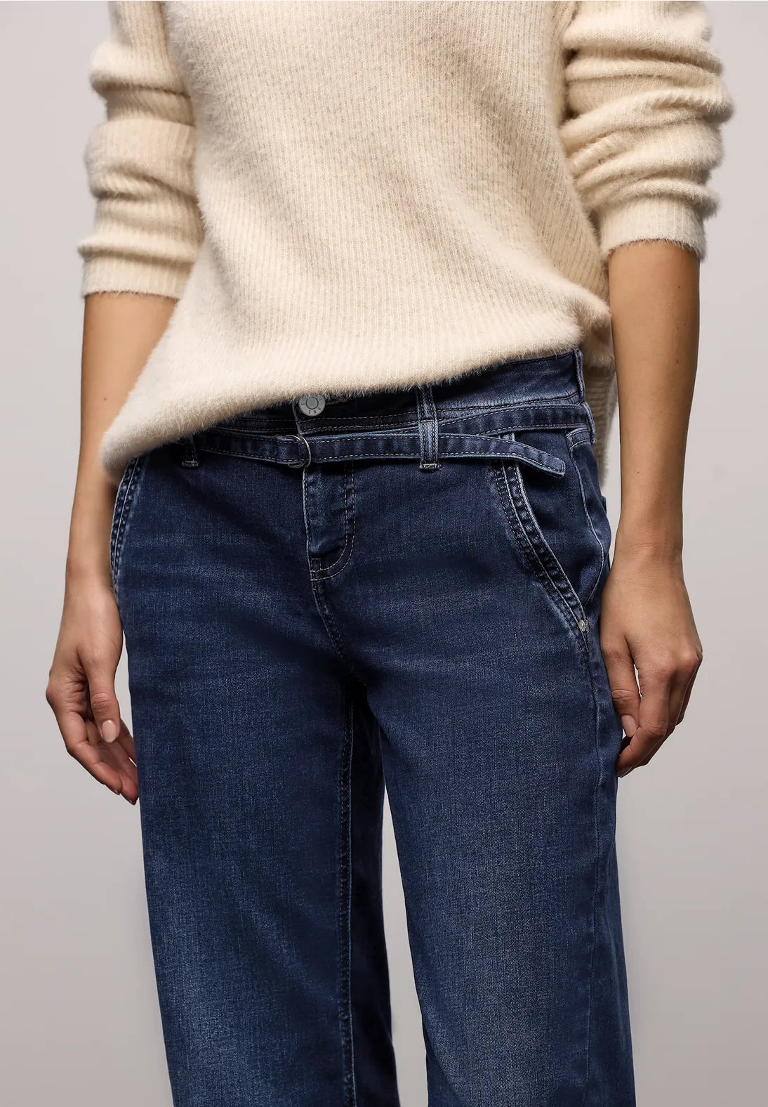 These Street One jeans for women combine mid waist, straight legs and a denim belt. The blue wash and side pockets complete the relaxed look - perfect for modern casual styles.