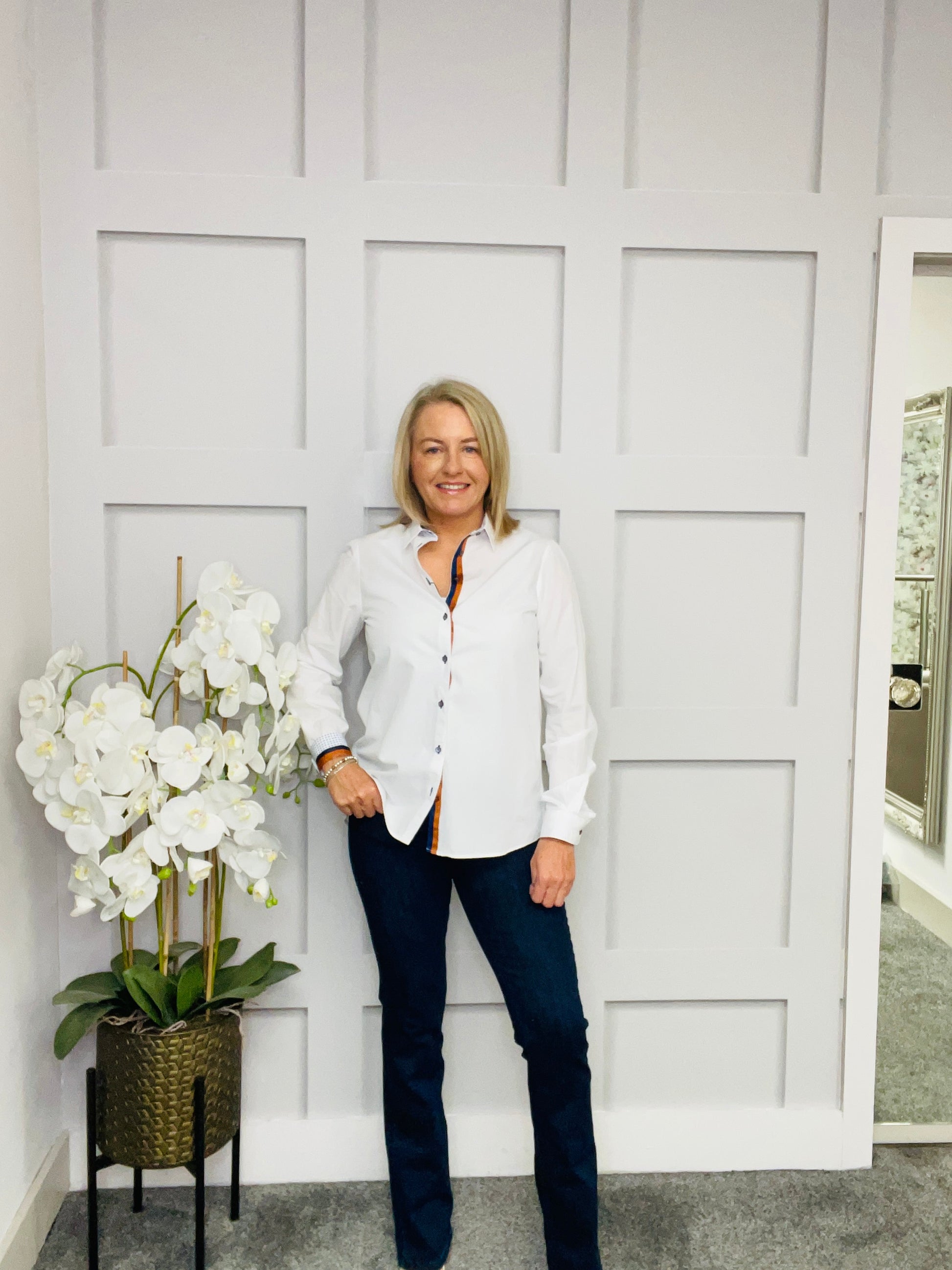 Plain shirt. Straight design. Shirt collar with printed detail. Front closure with buttons and contrasting two-colour inner ribbon detail. Long sleeves finished in cuff with button closure and coordinated strap detail. Slightly rounded underside with side openings.