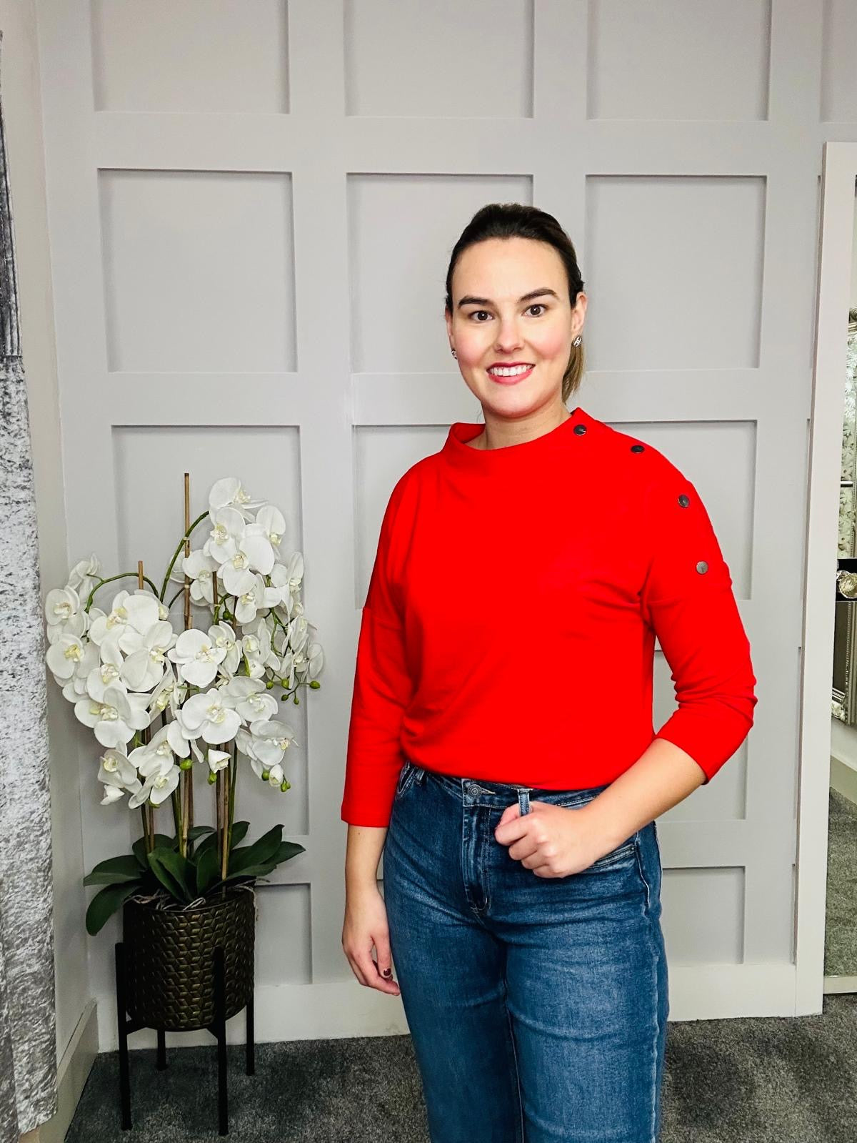 Red top made of soft material with button detail